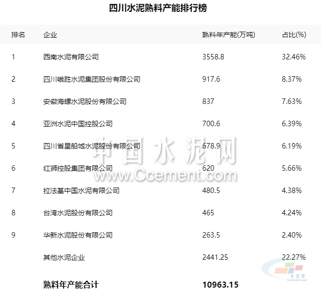 根據中國水泥網發(fā)布的2020中國水泥熟料產能百強榜之四川省熟料產能得知,截至2020年,四川水泥熟料年產能合計10963.15萬噸,其中,西南水泥占比最大為32.46%。